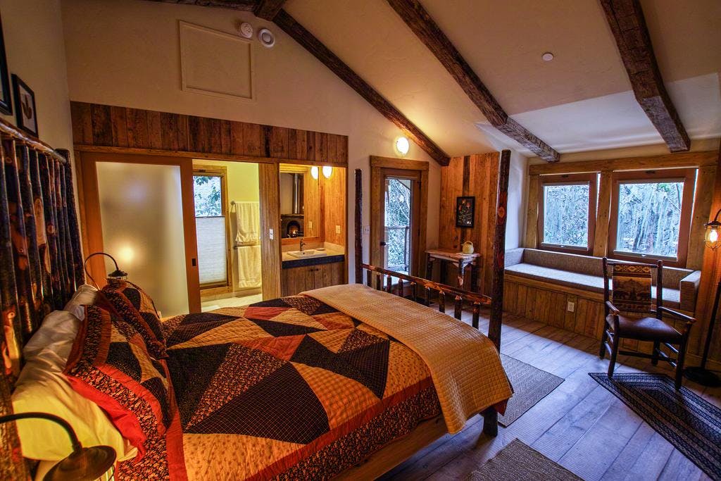 Beautiful and spacious second-floor room with private bath, wood beam ceilings, hand made furniture, wood floors, outside balcony, fireplace, work area and window seat. Very Quiet and peaceful location!